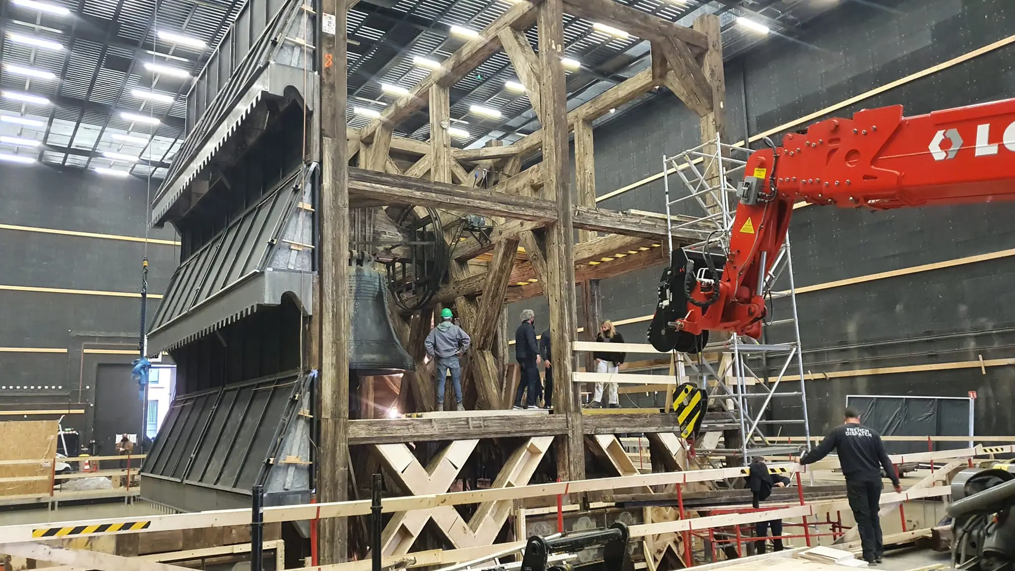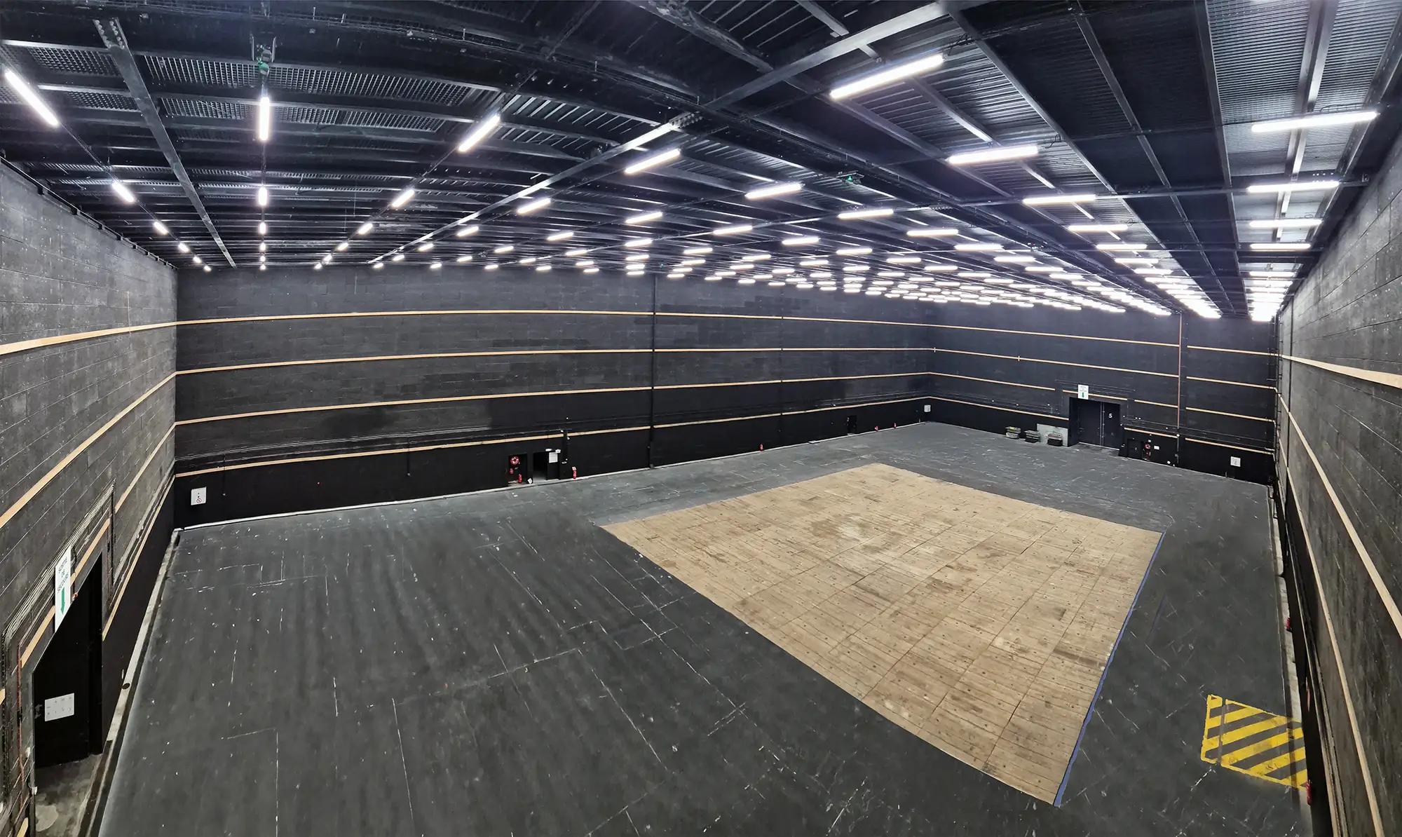 Accès : deux grandes doubles portes avec ouverture totale de l: 5 m x h: 5,6 m chacune + trois petites portes latérales